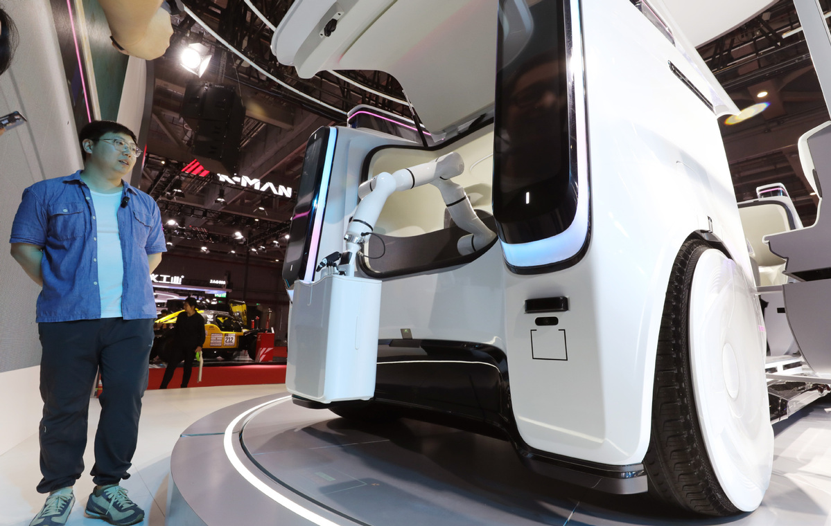 A visitor looks at an autonomous vehicle of DiDi at the 20th Shanghai International Automobile Industry Exhibition in Shanghai, April 18, 2023. [Photo/Xinhua]