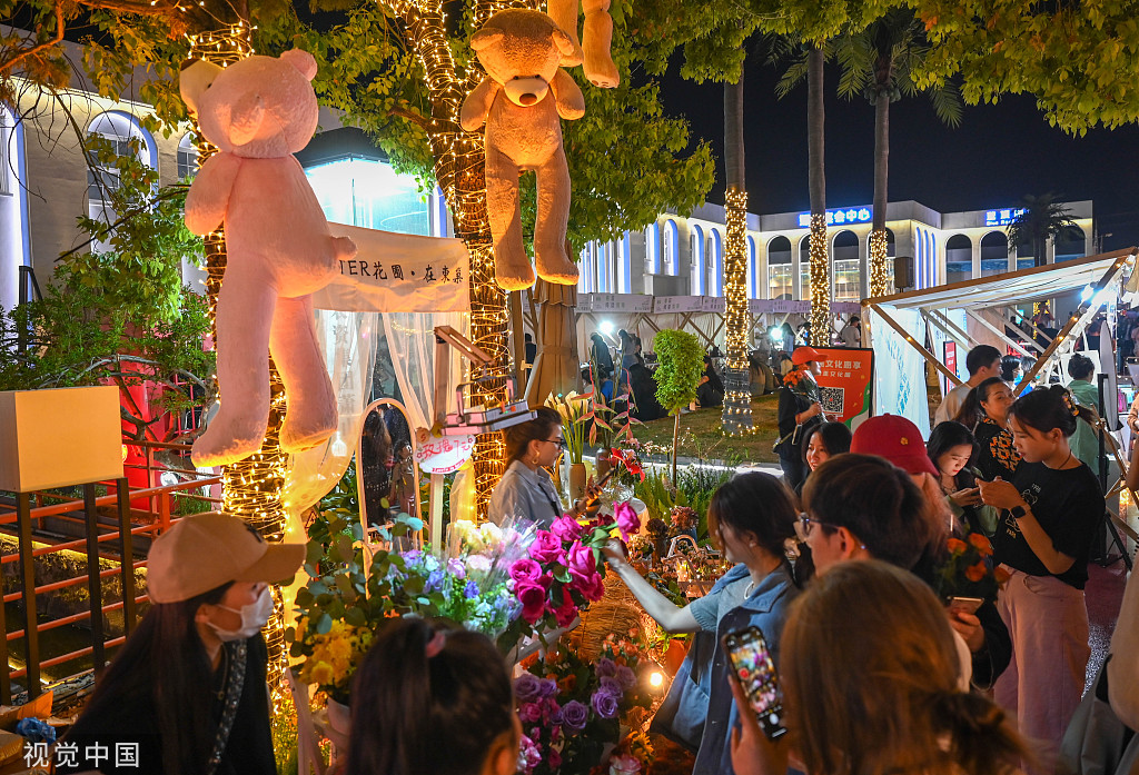Consumers select flowers at a stall in the night market at the Dongchao Art Park in Hangzhou, Zhejiang province on April 16, 2023. [Photo/VCG]