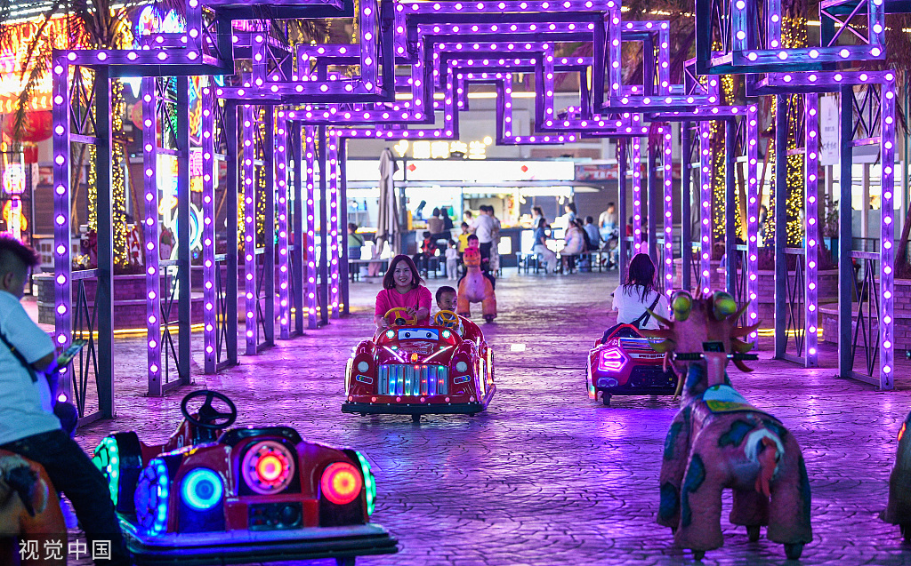 Parents drive electric cars with their children at a night culture and tourism market in Qianxinan Bouyei and Miao autonomous prefecture, Southwest China's Guizhou province on April 17, 2023. [Photo/VCG]