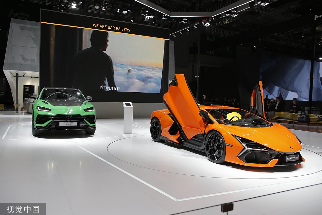 Lamborghini's HPEV (high performance electric vehicle) Revuelto (front), makes its Asia-Pacific debut at the Auto Shanghai 2023, April 21. [Photo/VCG]