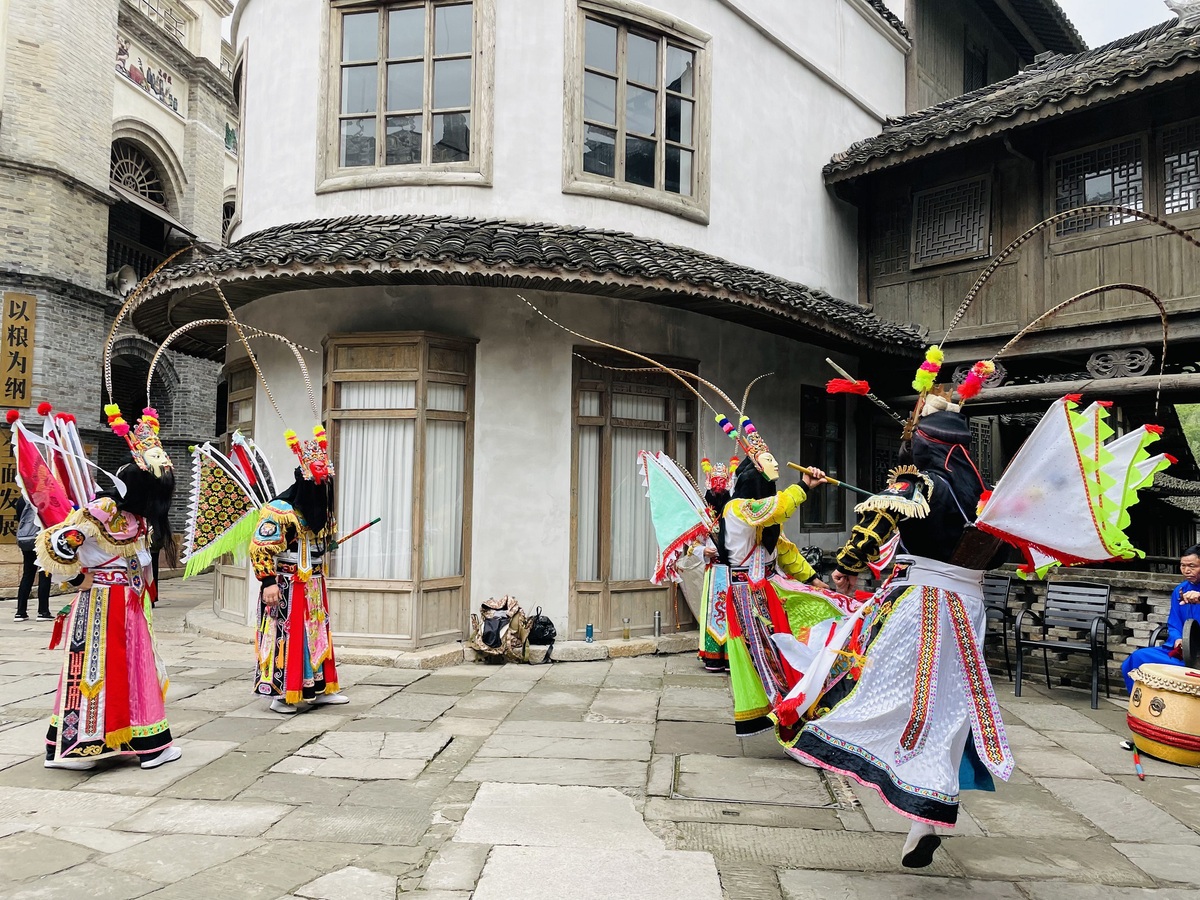 Inheritors of intangible heritage showcase a traditional opera at Wujiang Village Resort in Guizhou province. [Photo by Zhao Yandi and local media/Provided to chinadaily.com.cn]