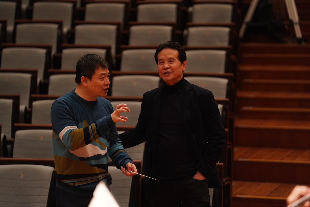 Conductor Zhang Yi and composer Zhou Xianglin during the rehearsal at the NCPA in Beijing on April 23. [Photo by Fang Fei/For China Daily]
