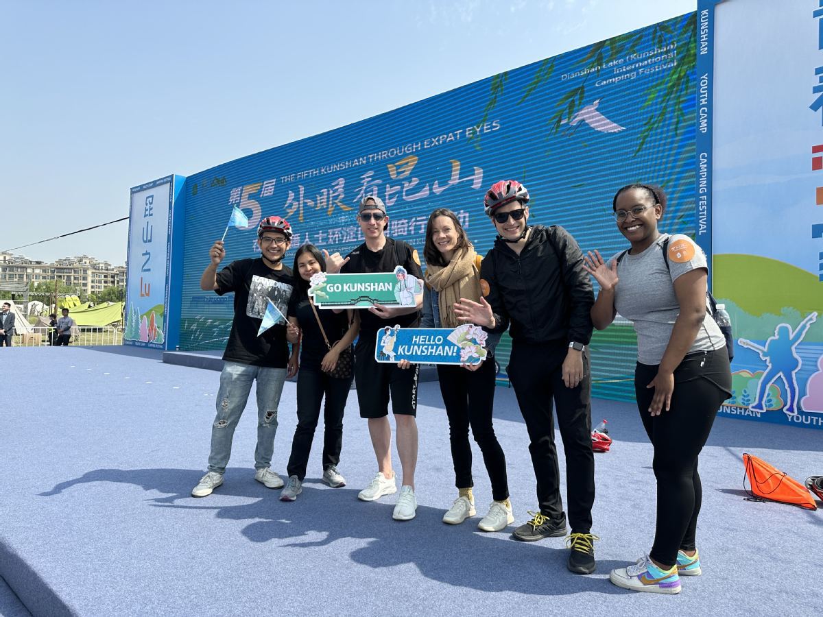 The international tourists were invited to an 11.3-kilometer (7-mile) lakeside cycling event, which began at the Half-Marathon Lawn, one of the eight most beautiful scenic spots by Dianshan Lake, and ended at the Le Camp, a well-known camping spot in Kunshan. During the ride, participants enjoyed the picturesque lake view and immersed themselves in the pleasant spring vibe.
