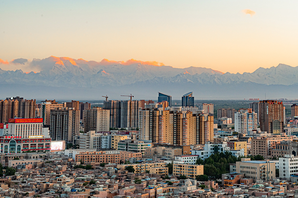A rare view of highest peak of Pamir Plateau together with Kashgar in Xinjiang