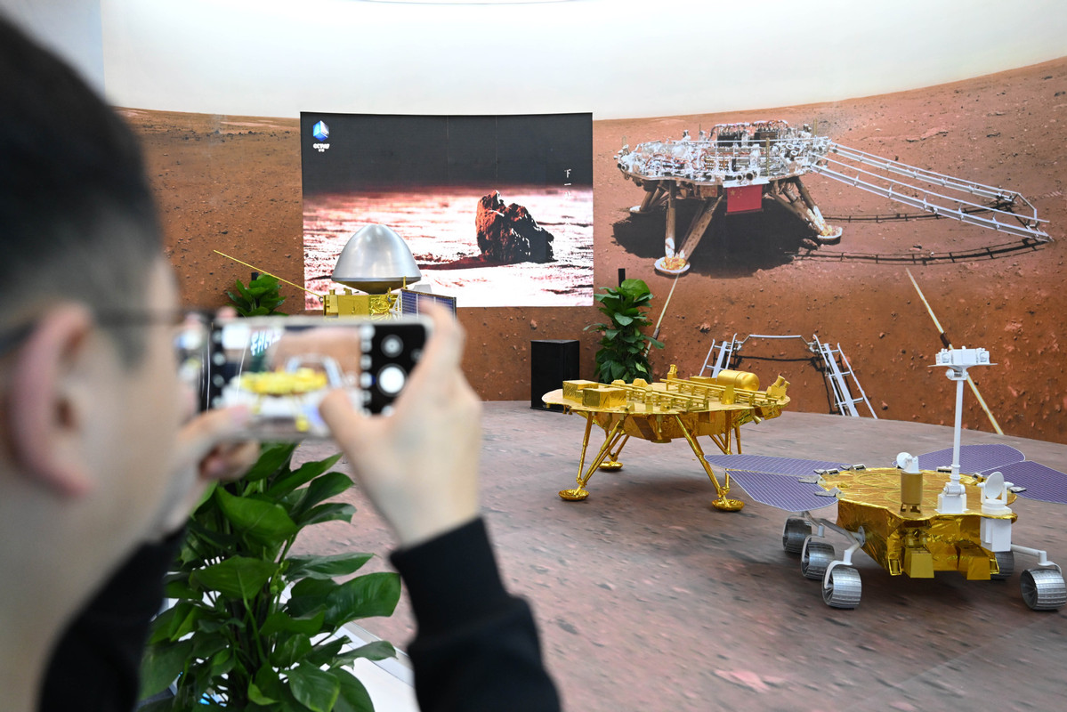 A visitor takes photos of Mars probe models at the aerospace expo held in Hefei of Anhui province, April 24, 2023. [Photo/Xinhua]