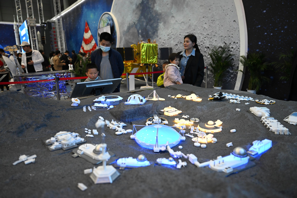 Visitors look at Lunar research station hypothetical models at the aerospace expo held in Hefei of Anhui province, April 24, 2023. [Photo/Xinhua]