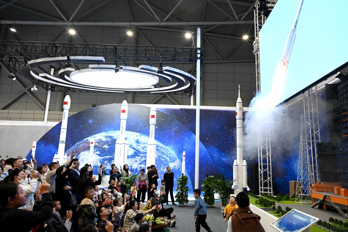 Visitors watch the simulated launch of the Long March 5B carrier rocket at the aerospace expo held in Hefei of Anhui province, April 24, 2023. [Photo/Xinhua]
