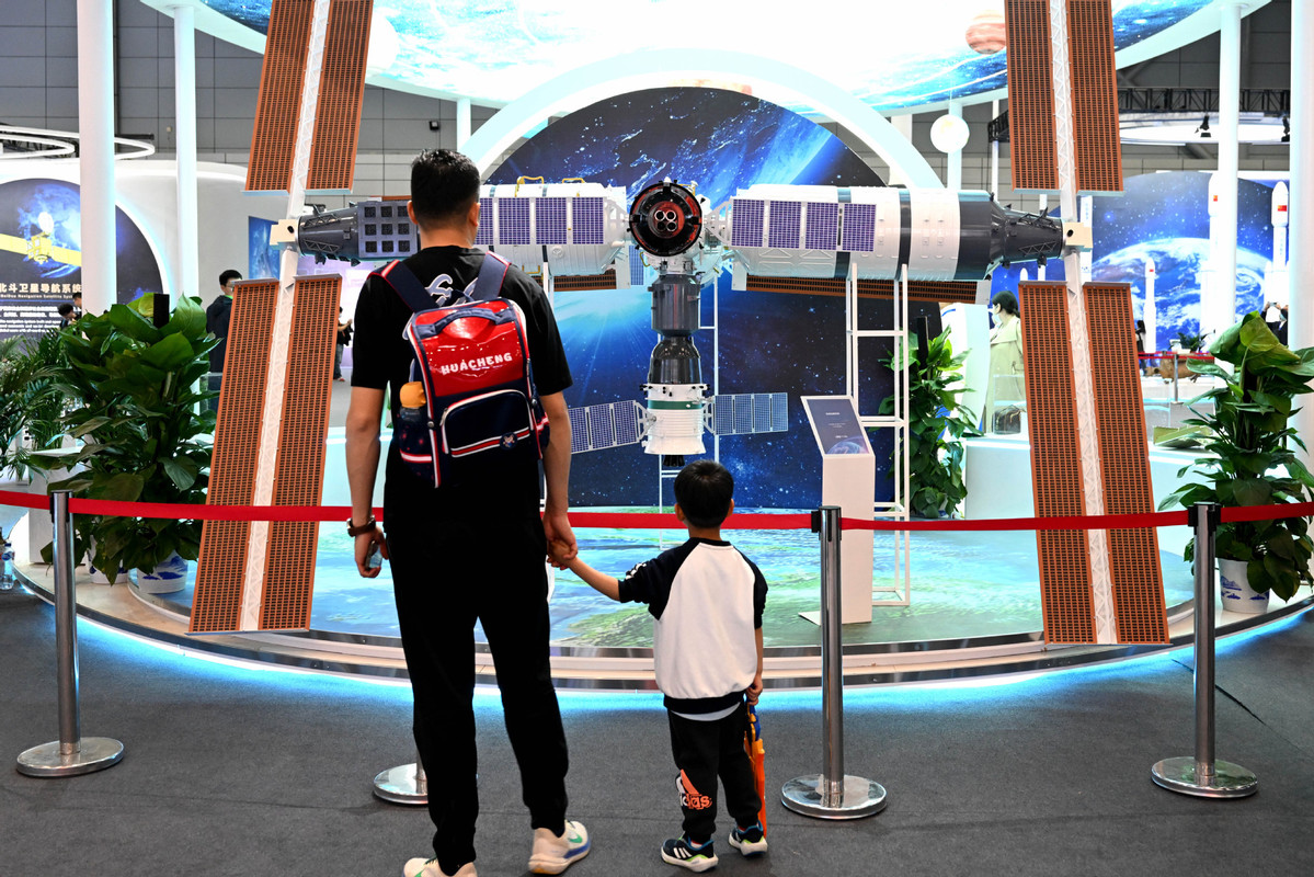 Visitors look at the space station assembly model at the aerospace expo held in Hefei of Anhui province, April 24, 2023. [Photo/Xinhua]