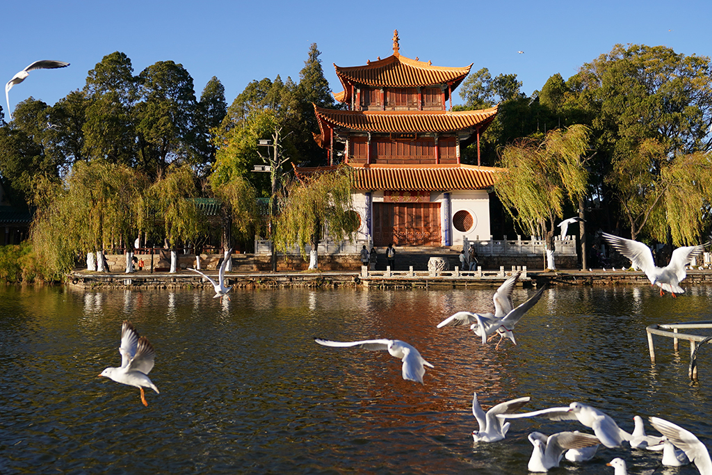Check out the Daguan Pavilion in Daguan Park, Kunming, Yunnan province! This stunning wooden structure with glazed tiles and bracket supports covers over 400 square meters. The pavilion dates back to the Qing Dynasty (1644-1911) and features a triple eave and upturned roofs, reflecting the traditional style of Chinese architecture.