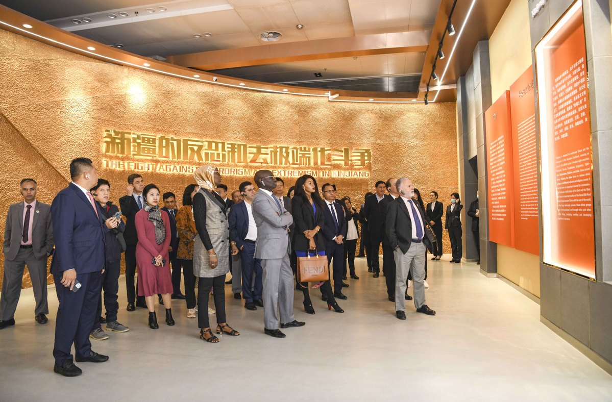 Foreign envoys visit an exhibition on the fight against terrorism and extremism in Xinjiang, in Urumqi, Northwest China's Xinjiang Uygur autonomous region, April 27, 2023. [Photo/Xinhua]