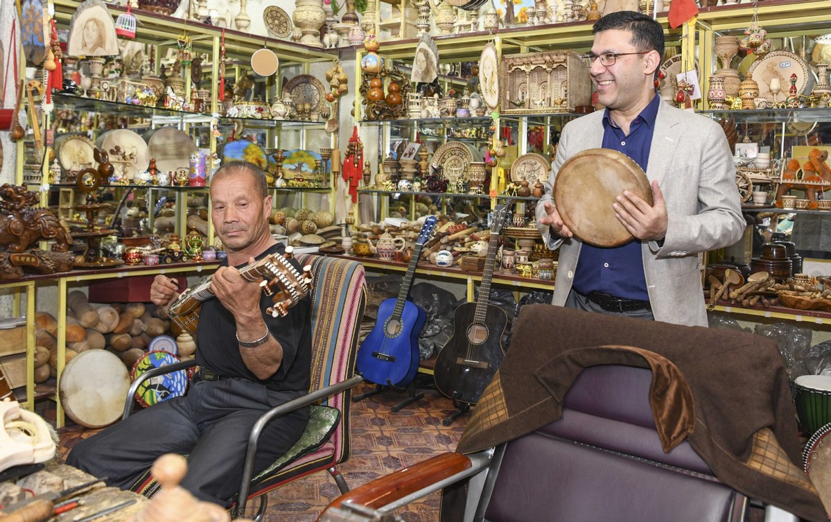Hossein Darvishi (R), Iranian consul general in Guangzhou, plays hand drum while visiting a musical instrument store in the old town of Kashgar, Northwest China's Xinjiang Uygur autonomous region, April 24, 2023. [Photo/Xinhua]
