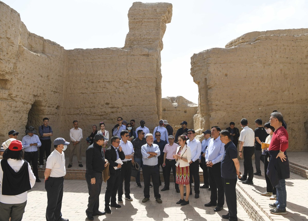 Foreign envoys visit the Jiaohe Ruins, a world cultural heritage site, in Turpan, Northwest China's Xinjiang Uygur autonomous region, April 26, 2023. [Photo/Xinhua]