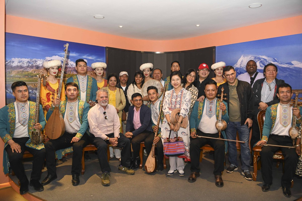 Foreign envoys pose for a group photo with folk musicians at a village known for the tradition of making musical instruments in Shufu county of Kashgar, Northwest China's Xinjiang Uygur autonomous region, April 25, 2023. [Photo/Xinhua]