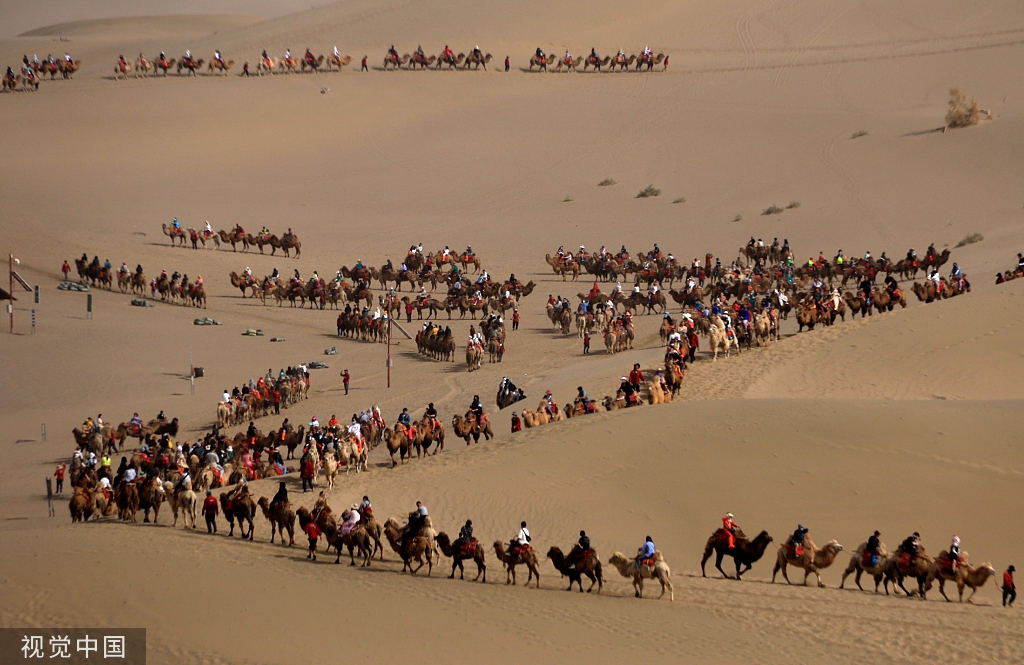 Tourists enjoy camel ride at the Mingsha Mountain and Yueya Spring scenic area in Dunhuang, Gansu province, on May 1, 2023. [Photo/VCG]