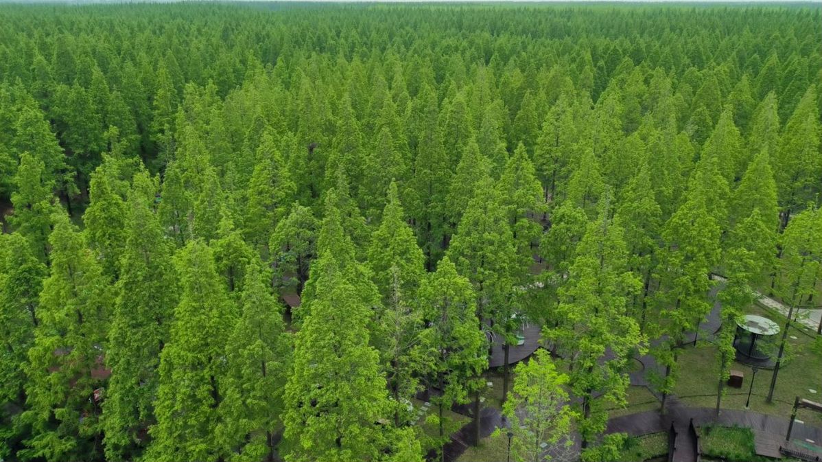 This photo shows vast man-made forest at the Yellow Sea Forest Park in Dongtai city, Yancheng city, East China's Jiangsu province, April 25, 2023. [Photo/chinadaily.com.cn]