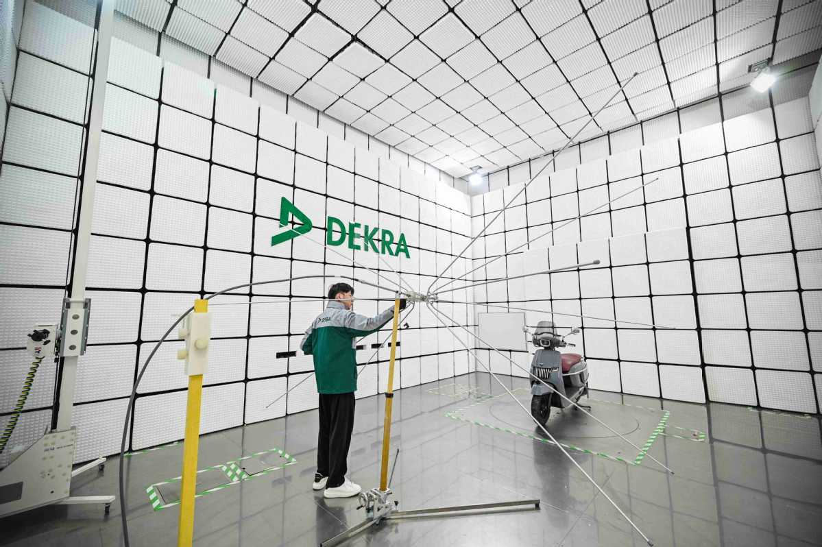 An engineer from Dekra China adjusts an antenna in preparation for a test of an electric motorcycle in an electromagnetic compatibility chamber, in Shanghai, in November, 2022. [Photo provided to CHINA DAILY]