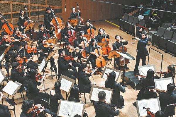 Tianjin Juilliard Orchestra performs under the baton of conductor Chen Lin at the school's concert hall. [Photo provided to China Daily]