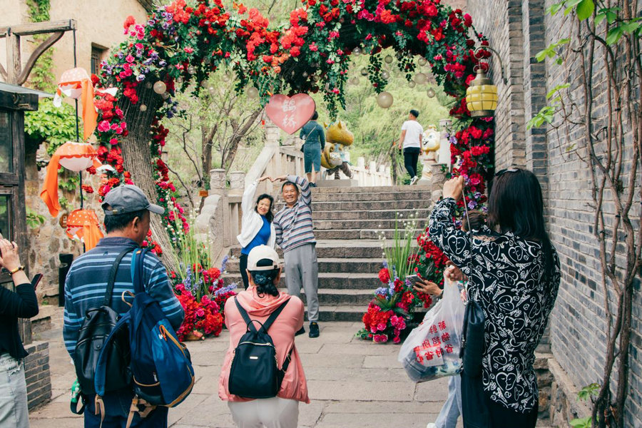 Visitors take photos under a mural at the town. [Photo provided to China Daily]