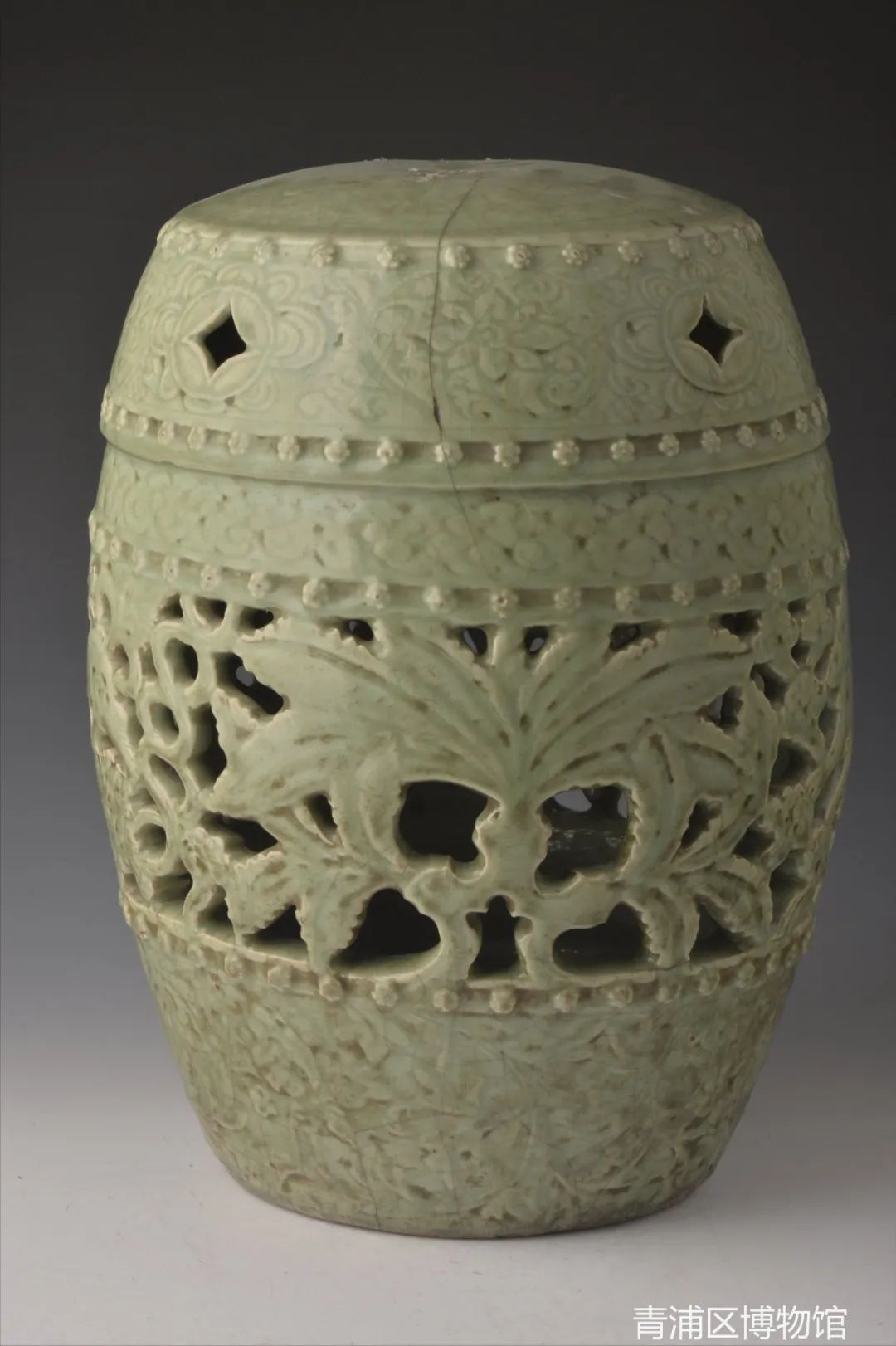 Ming Dynasty (1368-1644) Longquan Kiln celadon drum-shaped stool with openwork patterns [Photo/Official WeChat account of the Qingpu Museum]