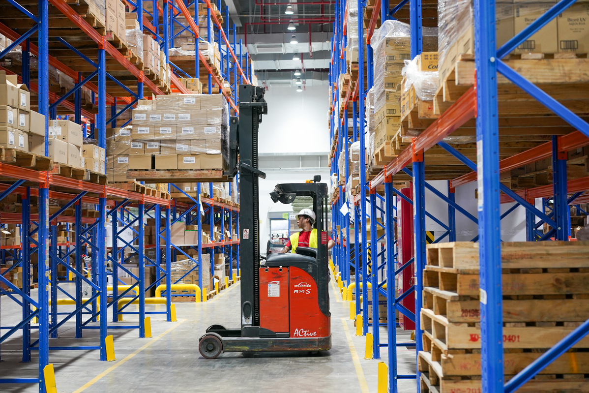 A Staff member transports cross-border e-commerce goods at the Bonded Logistics Center (Type B) in Hongqiao Business District in Shanghai, on May 13, 2023. [Photo by Gao Erqiang/chinadaily.com.cn]