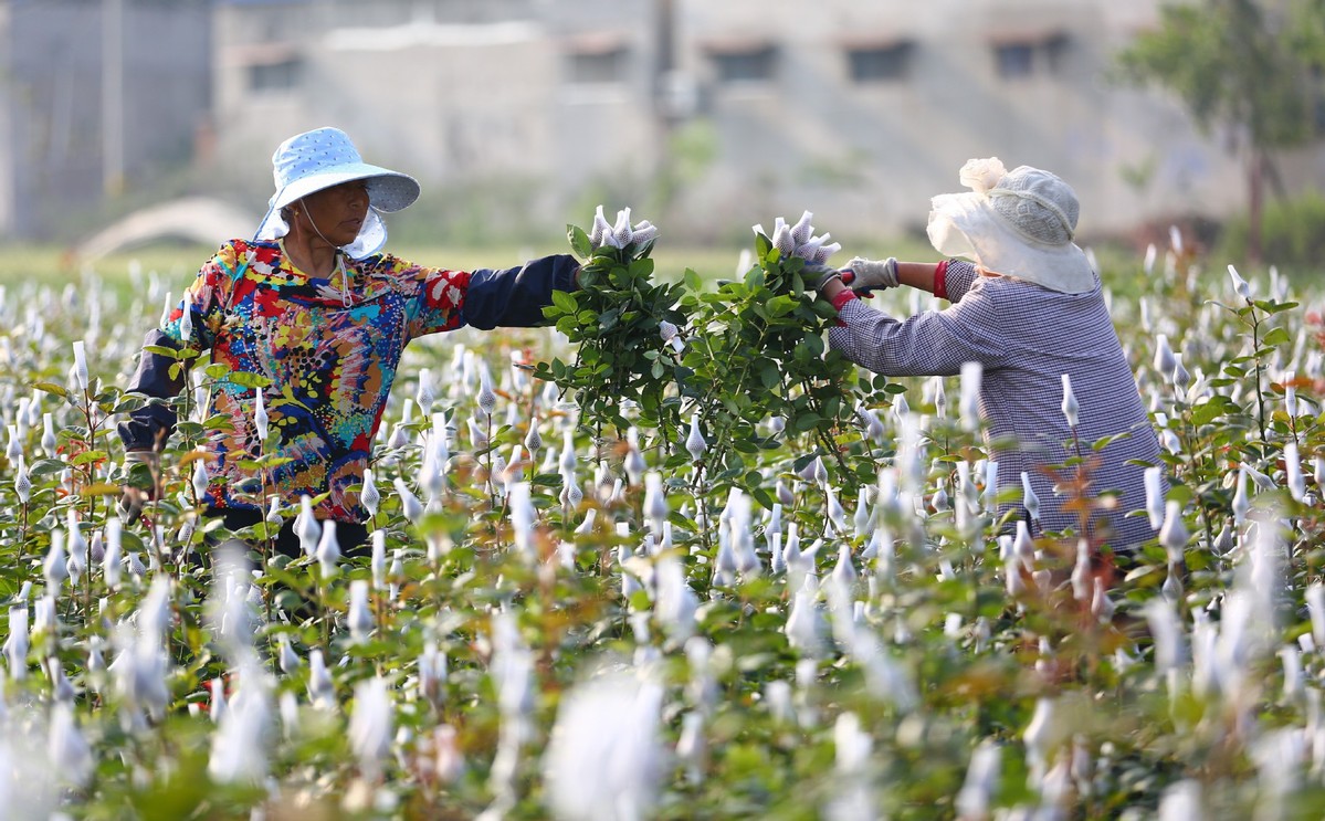 Farmers pick up roses at a flower cultivation base in Jiangtun town of Tengzhou city, East China's Shandong province, May 13, 2023. With flowers blooming in the early summer, the flower industry in China witnesses robust growth. [Photo/Xinhua]