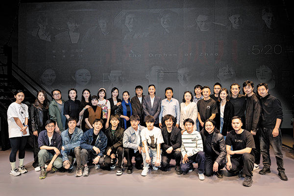 Young actors and actresses, who will perform in the new version of The Orphan of Zhao, pose with veteran artists of Beijing People's Art Theatre in Beijing on May 8.[Photo provided to China Daily]