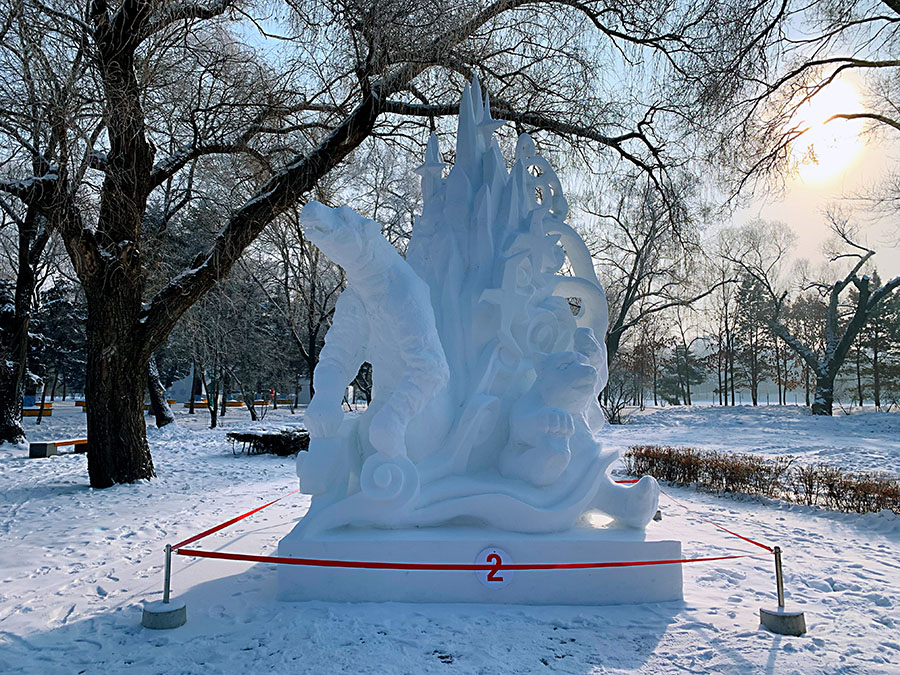 A snow sculpture created by students from Qiqihar University won second prize at the 7th Heilongjiang University Student Snow Sculpture Competition held at Sun Island in Harbin, capital of Northeast China's Heilongjiang province from Friday to Monday. [Photo by Zhou Huiying/chinadaily.com.cn]