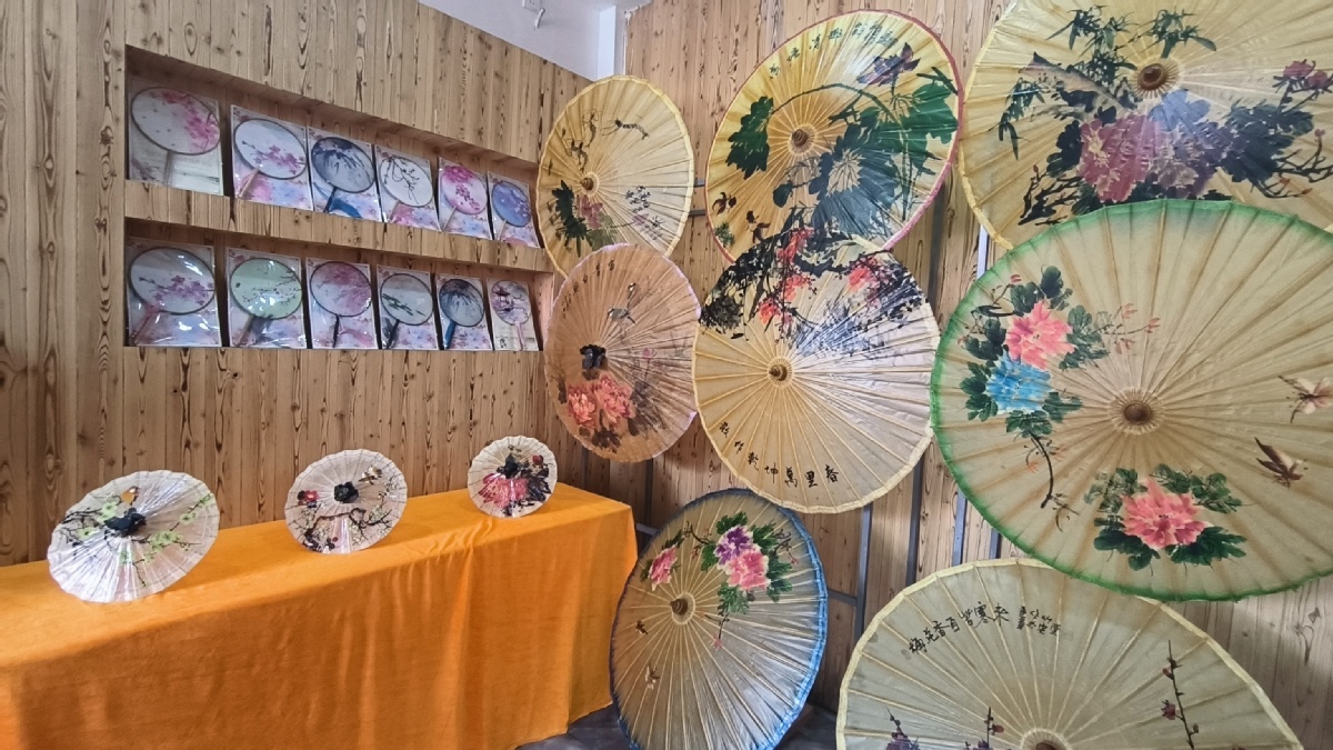 A variety of oil-paper umbrellas are on display at a workshop at Qiyun tourism town, Xiuning county of Huangshan city, Anhui province,May 15, 2023. [Photo by Zhang Wenfang/chinadaily.com.cn]