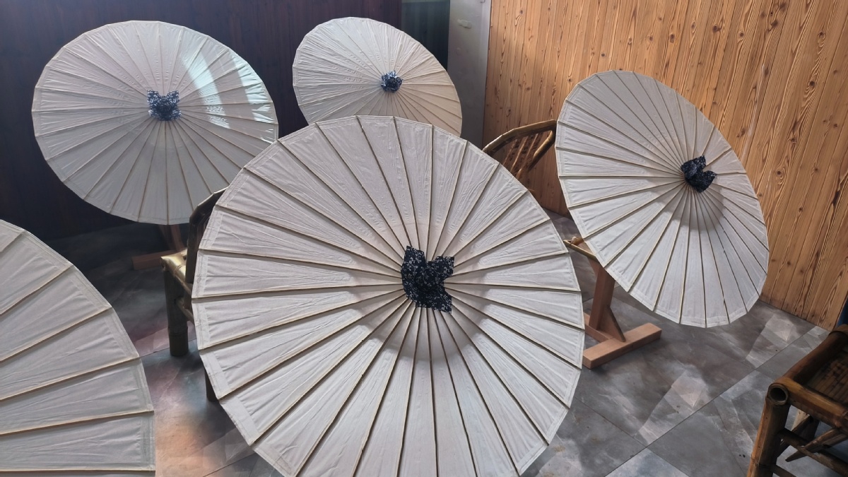 The unfinished oil-paper umbrella is placed at a workshop at Qiyun tourism town, Xiuning county of Huangshan city, Anhui province, May 15, 2023. [Photo by Zhang Wenfang/chinadaily.com.cn]