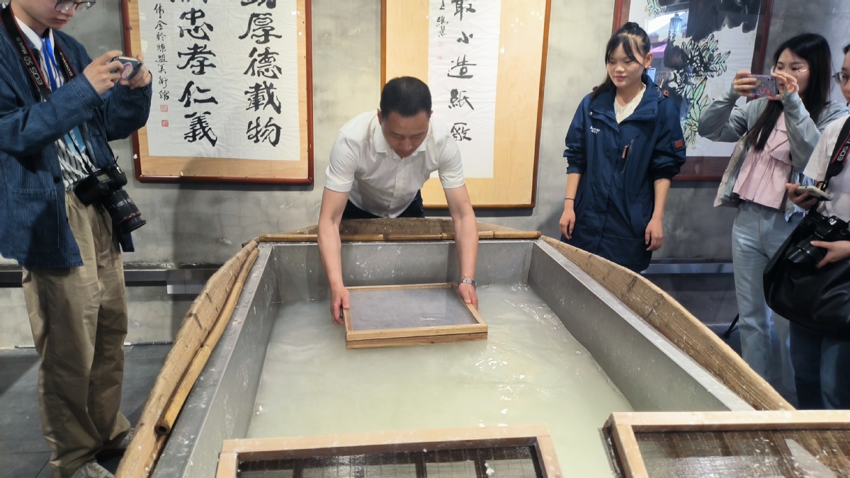 People experience the making of Chinese art paper at Qiyun tourism town, Xiuning county of Huangshan city, Anhui province, May 15, 2023. [Photo by Zhang Wenfang/chinadaily.com.cn]