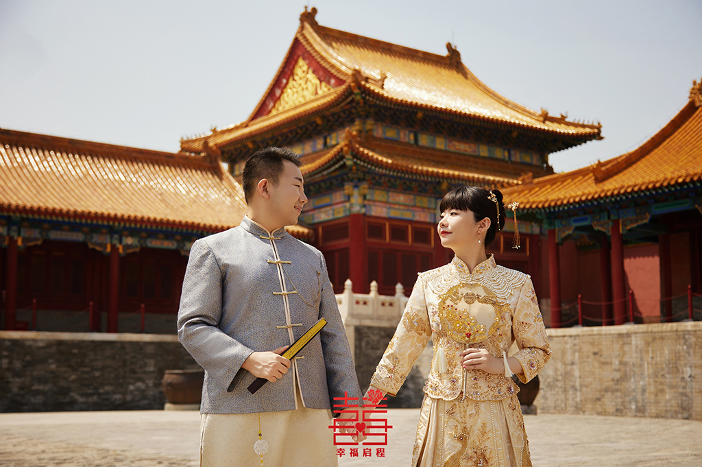 A couple dressed in exquisite traditional Chinese costumes take wedding photos in the Forbidden City in Beijing. [Photo provided to chinaservicesinfo.com]