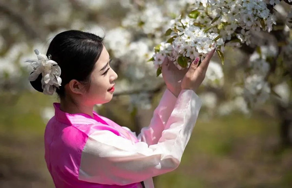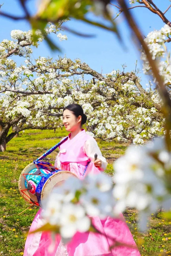 A woman dressed in traditional Korean attire poses for photos next to white pear blossoms in Shuangxin village of Hunchun city in Yanbian Korean autonomous prefecture, Northeast China's Jilin province. The pear orchards in Yanbian have welcomed their annual bloom, painting a dreamlike landscape with a refreshing fragrance lingering in the air. [Photo/Wangqing County Photographers Association]