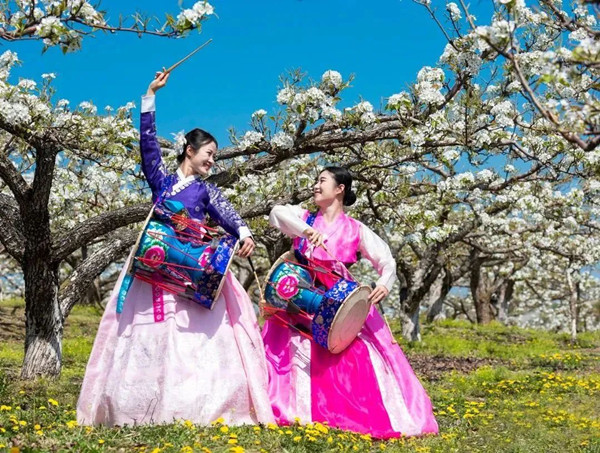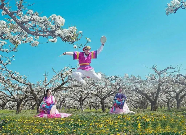 Women dressed in Korean costumes pose for pictures with pear blossoms in Yanbian Korean autonomous prefecture, Jilin province. The pears have reached their prime blossoming period, carpeting the orchard in a sea of sparkling white flowers. [Photo/Wangqing County Photographers Association]