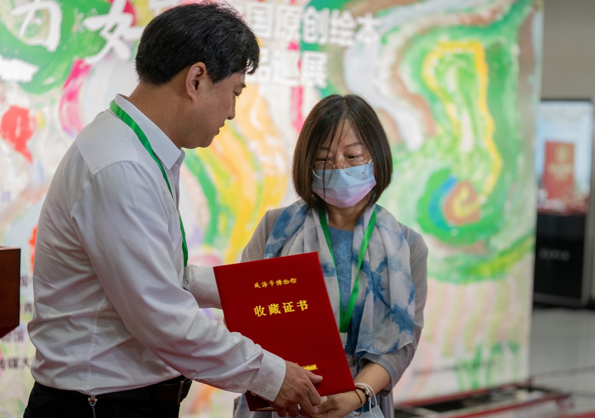 During the opening ceremony of the Weihai exhibition, curators Wang Lijun and Long Niannan donated a collection of picture books with stories set in Weihai to the Weihai Museum. The collection includes Homecoming, Looking for Mom, Seaside Cottage, and Lord Liu Pacifying the Sea, all created by renowned picture book authors and published by Tianjin People's Fine Arts Publishing Group.
