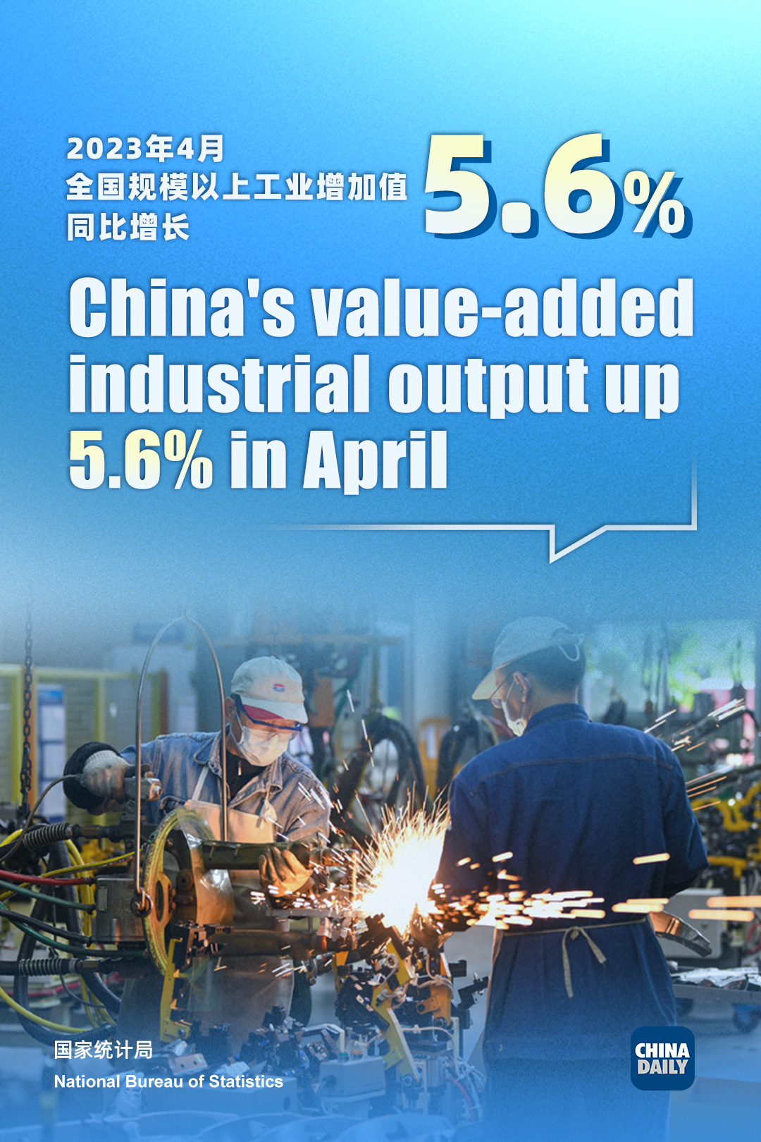 China's value-added industrial output, an important economic indicator on the supply side, went up 5.6 percent year-on-year in April, expanding by 1.7 percentage points from the level in March, according to data from the NBS.