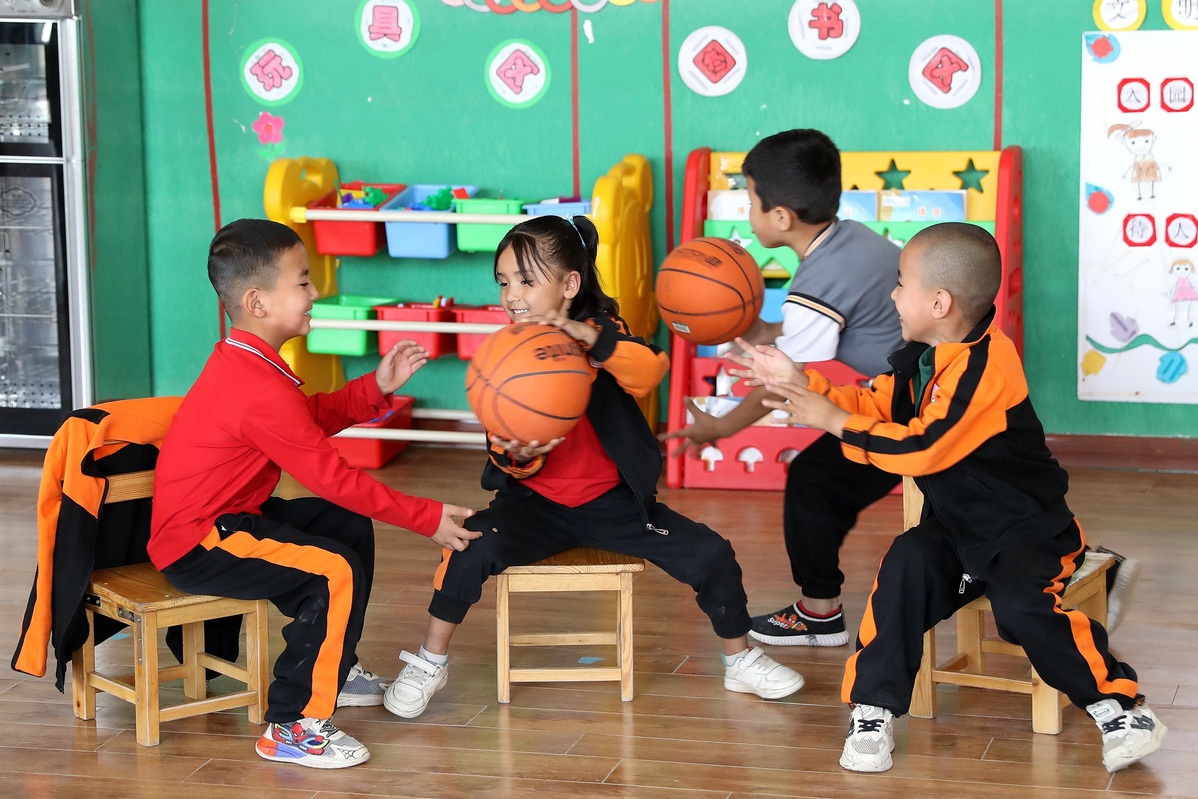 Children play basketballs at a kindergarten in Jinnan New Village of Qira county, Hotan. [Photo by Wang Zhuangfei/chinadaily.com.cn]