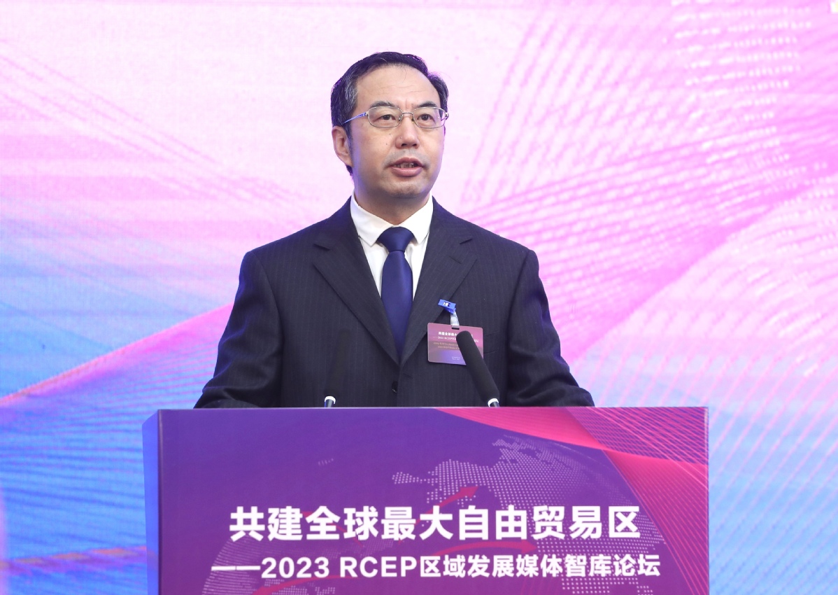 Wang Bin, a member of the Standing Committee of the CPC Hainan Provincial Committee and head of the provincial Party committee's Publicity Department, speaks at the opening ceremony of the third RCEP Media & Think Tank Forum in Haikou, Hainan province on Sunday. [Photo by Zou Hong/China Daily]