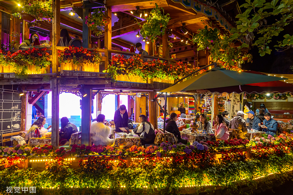 Diners enjoy food at a restaurant in the ancient city of Lijiang, Yunnan province on April 9, 2023. [Photo/VCG]