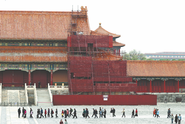 Tourists walk by the Gate of Supreme Harmony, which is under restoration, at the Palace Museum, on April 23. ZOU HONG/CHINA DAILY