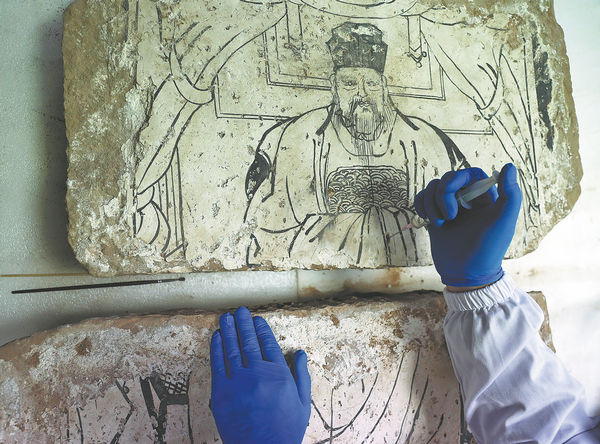 On March 23, at Shanxi Museum in Taiyuan, Shanxi, a restorer works on a mural, while another takes a photo of a relic. ZOU HONG/CHINA DAILY