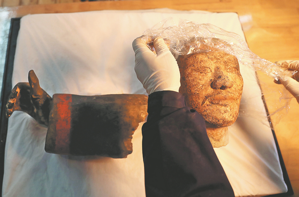 A restorer working on parts of a Terracotta Warrior at Emperor Qinshihuang's Mausoleum Site Museum in Xi'an, Shaanxi province, on April 3. ZOU HONG/CHINA DAILY