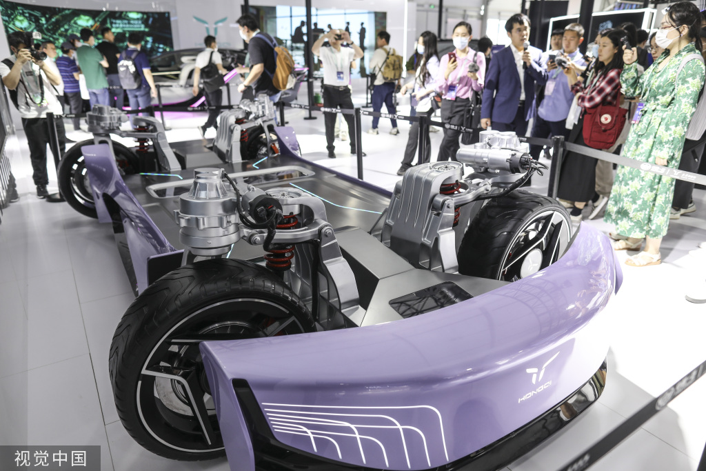 Car maker FAW's Hongqi brand shows its chassis domain control technology at the exhibition area of 2023 ZGC Forum held in Beijing, May 24, 2023. [Photo/VCG]