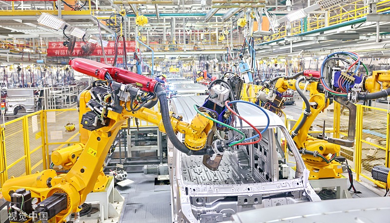 Robot arms assemble new energy vehicles at an automation production line in Ganzhou, Jiangxi province on May 6, 2023. [Photo/VCG]