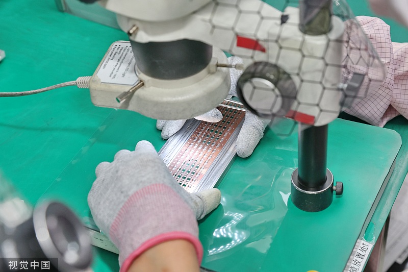 A professional staff member works at an advanced packaging production line of a microelectronics in Nantong, East China's Jiangsu province, Sept 16, 2022. [Photo/VCG]