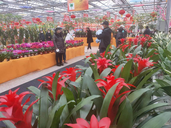 Visitors pick flowers at the agricultural expo in Changchun, for the upcoming Spring Festival which falls on Jan 22 this year. The agricultural expo, part of Changchun's ice and snow tourism program of activities, runs to Jan 28. [Photo provided to gojilin.gov.cn]