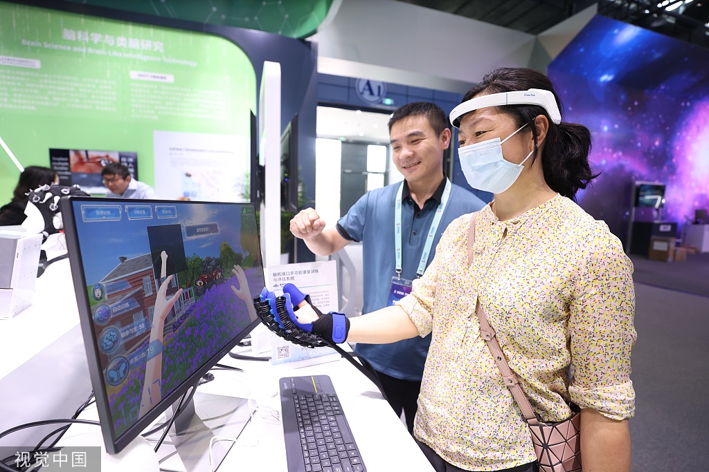 A woman experiences the brain-computer interface hand function rehabilitation training and evaluation system at the exhibition of the 2023 Zhongguancun Forum in Beijing, May 28, 2023. [Photo/VCG]
