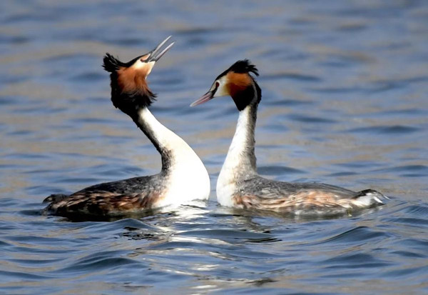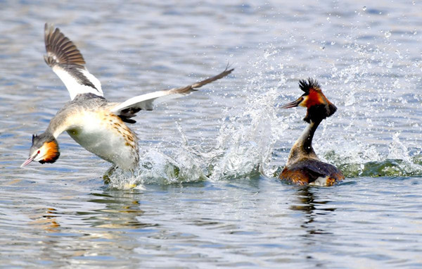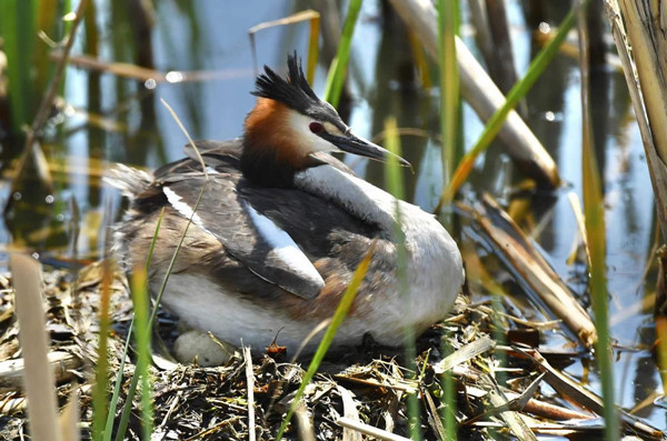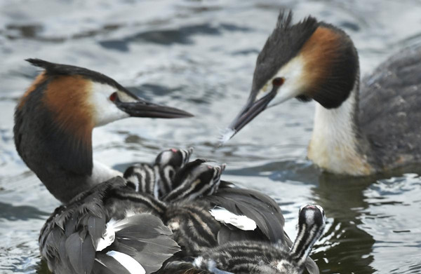 The reproductive behavior of great crested grebes was photographed over a 50-day period – from courtship to egg laying and hatching – at Nanxi Wetland Park in Changchun, Jilin province. Newborn grebes were seen swimming with their parents recently in the Yitong River, attracting residents and photographers to enjoy the early summer sunshine. [Photo/China Daily]