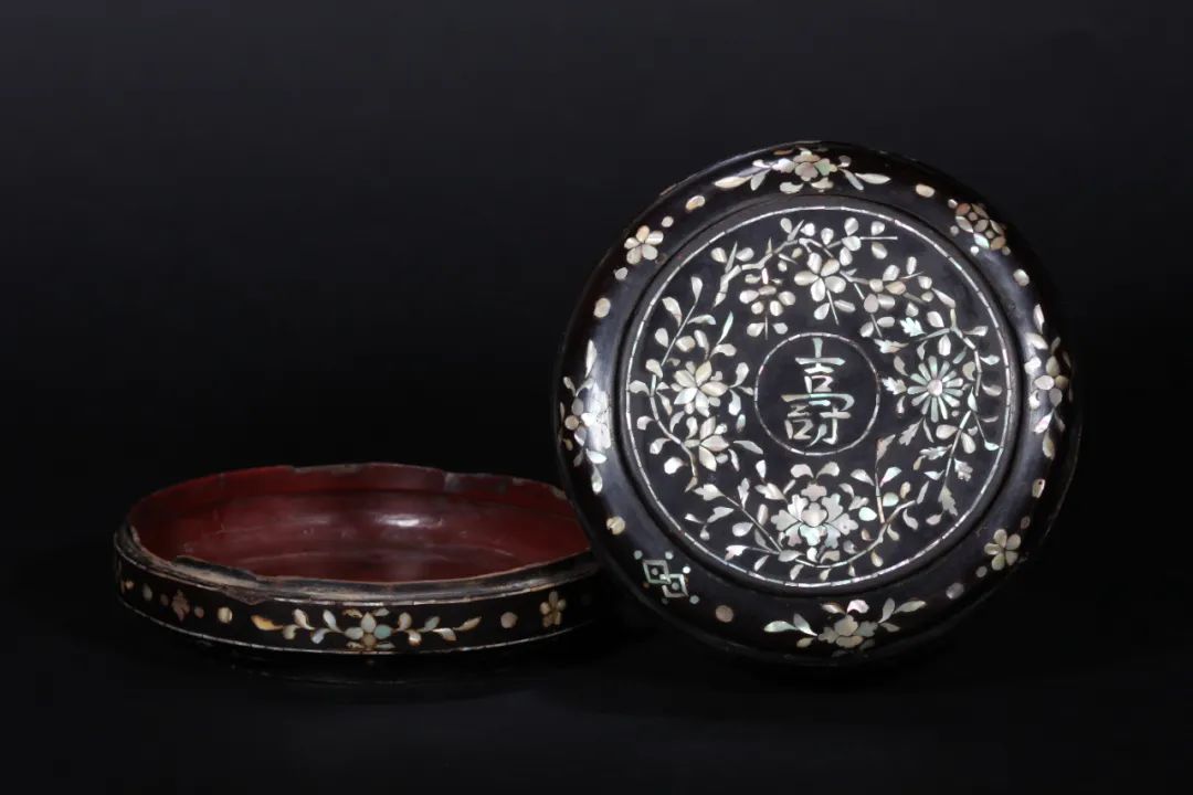 Black lacquer box embedded with mother-of-pearl interlocking lotus and
