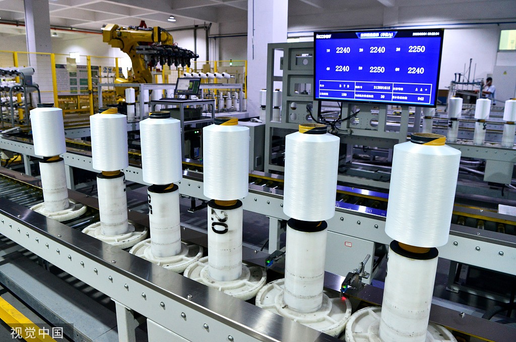A monitor screen ensures the textile's quality at the production line at an intelligent workshop of a chemical fiber textile enterprise in Fuzhou, Fujian province on May 31, 2023. [Photo/VCG]