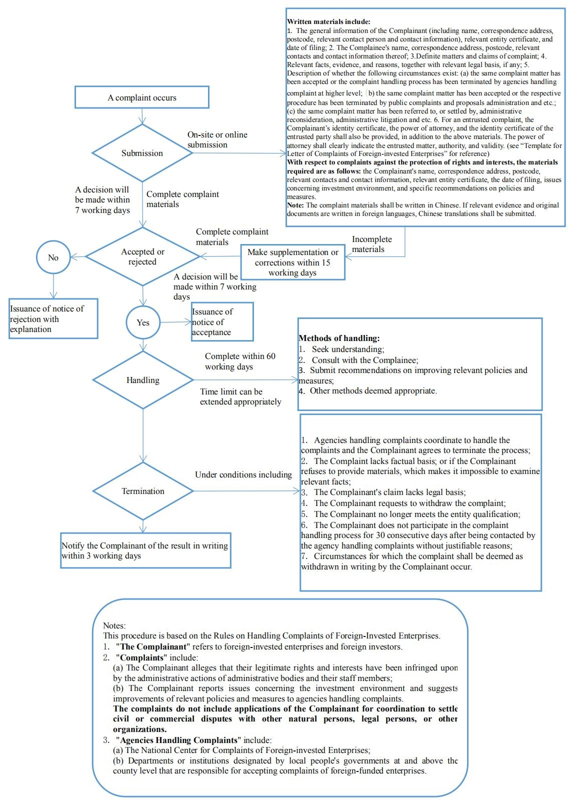 In accordance with the Foreign Investment Law and its Implementing Regulations, China has established a mechanism for foreign-invested enterprises' complaints and settlements to handle problems raised by foreign-invested enterprises or their investors more promptly and to coordinate and improve relevant policies and measures.